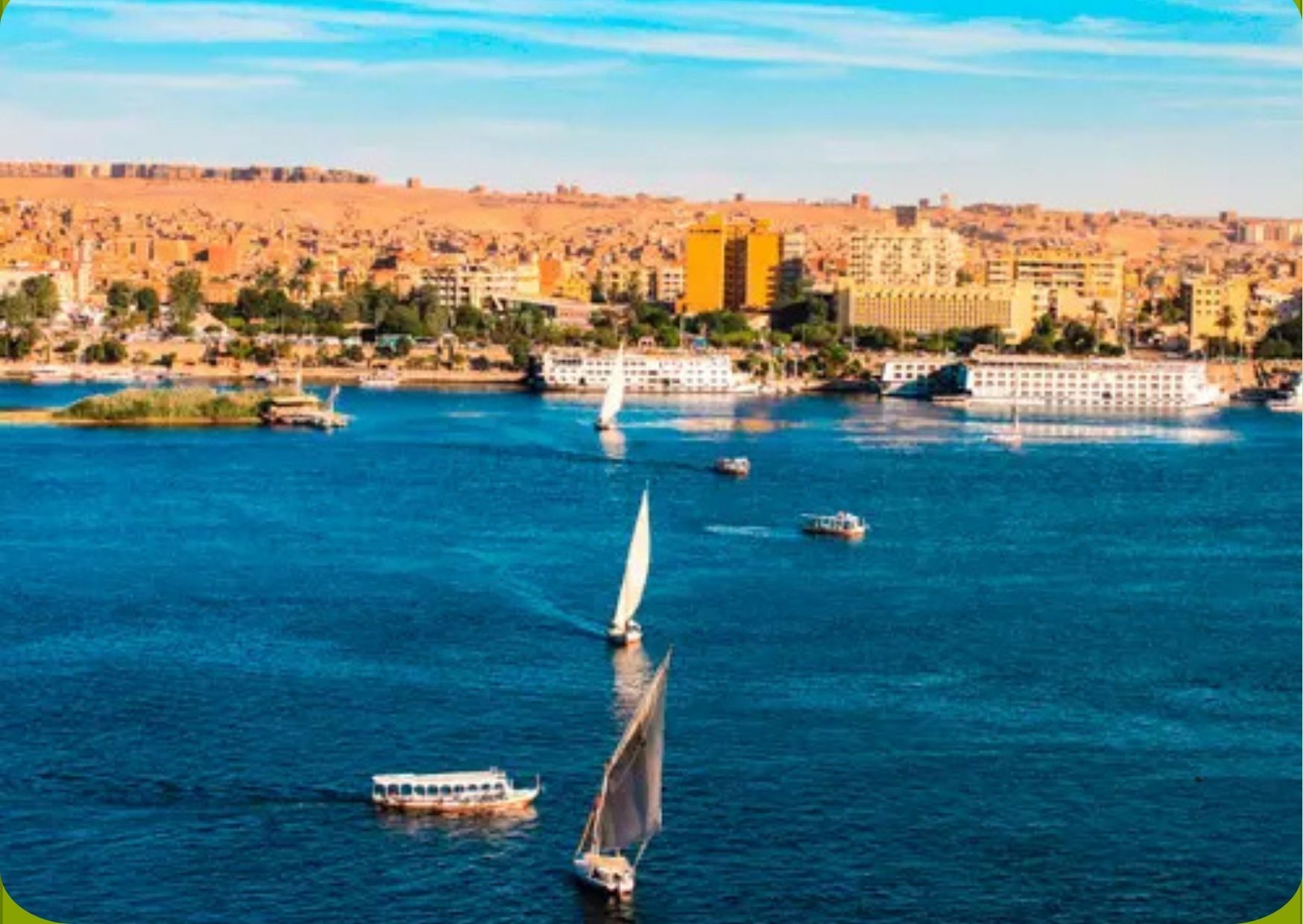 Desayuno buffet en el hotel. Traslado en autobús privado de regreso a Aswan donde embarcaremos en nuestra motonave, para comenzar la navegación por el río Nilo. Embarque y almuerzo a bordo. Por la tarde paseo en Faluca para realizar una visita panorámica desde el Nilo, al Jardín Botánico, la Isla Elefantina, y el Mausoleo del Agha Khan. (paseo en faluca panorámica, sin paradas). Posibilidad de realizar una visita opcional a los poblados nubios, uno de los pueblos más antiguos de África y vivir la experiencia de montar en camello (no incluida en el precio, se reserva en destino). Alojamiento en el Crucero.